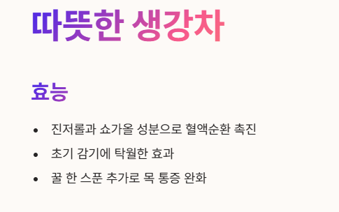 - 생강의 진저롤과 쇼가올 성분은 몸을 따뜻하게 만들어 혈액순환을 돕고 감기 기운을 쫓아내는 데 탁월해요. 🔥