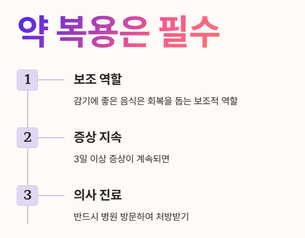 - 증상이 심하거나 3일 이상 지속된다면 반드시 의사의 진료를 받고 처방에 따라 약을 복용해야 합니다. 👨⚕️
