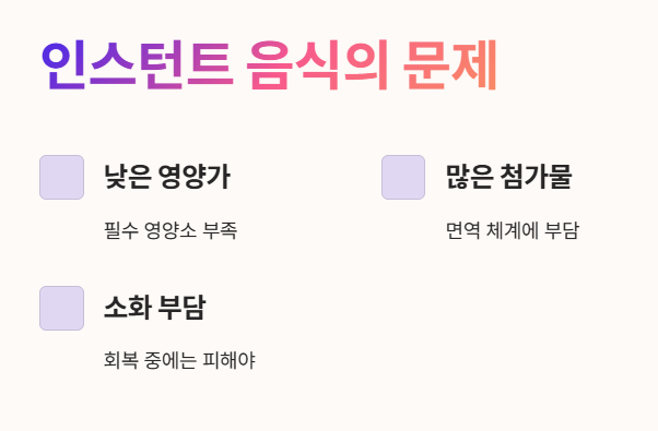 - 인스턴트 음식은 영양가가 낮고 첨가물이 많아 면역 체계에 부담을 줄 수 있습니다.