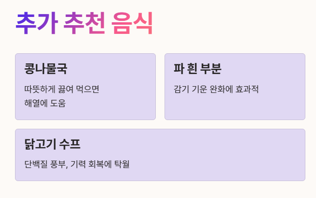 - 감기 회복 중에는 소화가 잘되고 영양이 풍부한 음식을 드시는 것이 좋습니다.