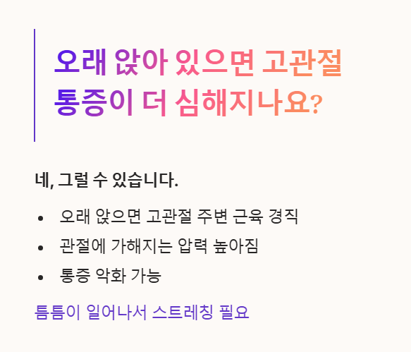 - 오래 앉아 있으면 고관절 주변 근육이 경직되고 관절에 가해지는 압력이 높아져 통증이 악화될 수 있어요.