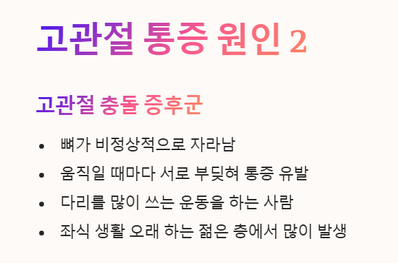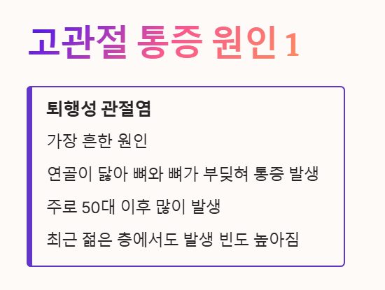 - 가장 흔한 원인으로, 나이가 들면서 관절을 보호하는 연골이 닳아 없어지면서 뼈와 뼈가 부딪혀 통증이 발생해요.