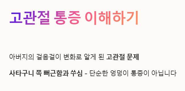 최근 저희 아버지가 걸음걸이가 불편해 보이셔서 여쭤보니, "사타구니 쪽이 뻐근하고 쑤신다"고 하시더라고요. 😥