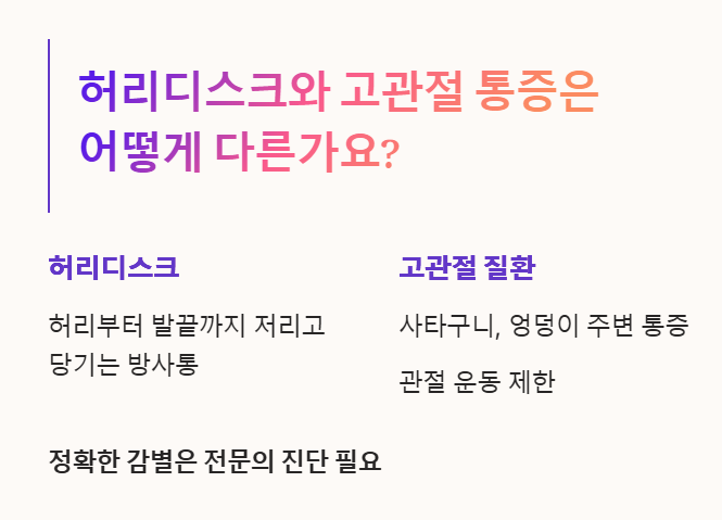 - 일반적으로 허리디스크는 허리부터 발끝까지 저리고 당기는 방사통이 특징이고, 고관절 질환은 사타구니나 엉덩이 주변 통증과 관절 운동 제한이 주된 증상입니다.