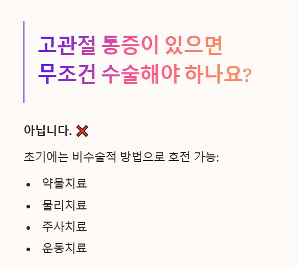 Q1: 고관절 통증이 있으면 무조건 수술해야 하나요?