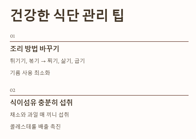 식단 관리로 콜레스테롤 수치를 낮추는 꿀팁까지 모두 확인하세요. 😉