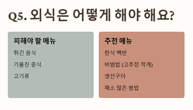 - 외식 시에는 튀긴 음식이나 기름진 중식, 고기류보다는 한식 백반, 비빔밥(고추장 적게), 생선구이, 채소가 많은 쌈밥 등을 선택하는 것이 현명해요. 🍚