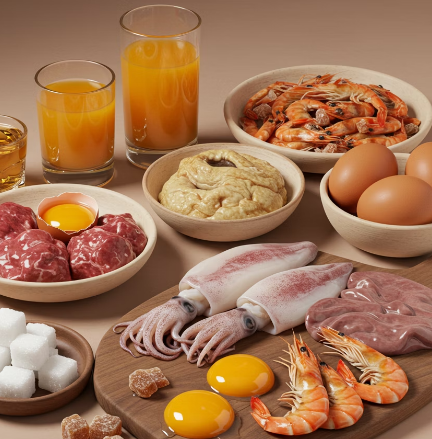 - 달걀노른자, 내장류(간, 곱창), 오징어, 새우, 장어 🍳
