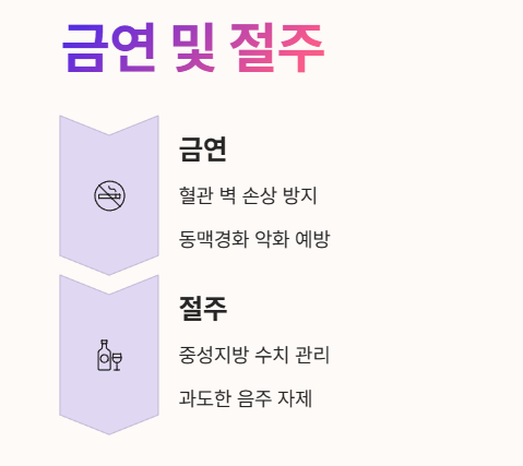 - 흡연은 혈관 벽을 손상시켜 동맥경화를 악화시키는 주범이에요. 🚭