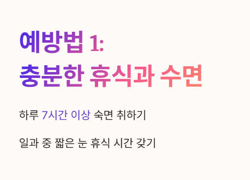 - 하루 7시간 이상 숙면을 취하고, 일과 중에 짧게라도 눈을 감고 휴식하는 시간을 갖는 것이 좋아요. 😴