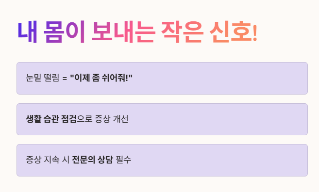 눈밑 떨림은 우리 몸이 "이제 좀 쉬어줘!"라고 보내는 작은 신호와 같아요. 🏃♂️