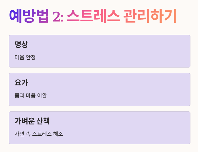- 명상, 요가, 가벼운 산책 등 자신만의 스트레스 해소법을 찾아 실천해 보세요.