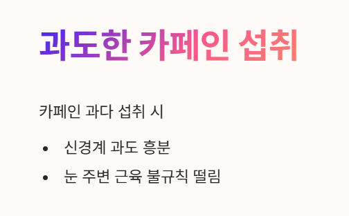- 이로 인해 눈 주변의 미세한 근육들이 불규칙적으로 떨리는 증상이 나타날 수 있답니다. ☕
