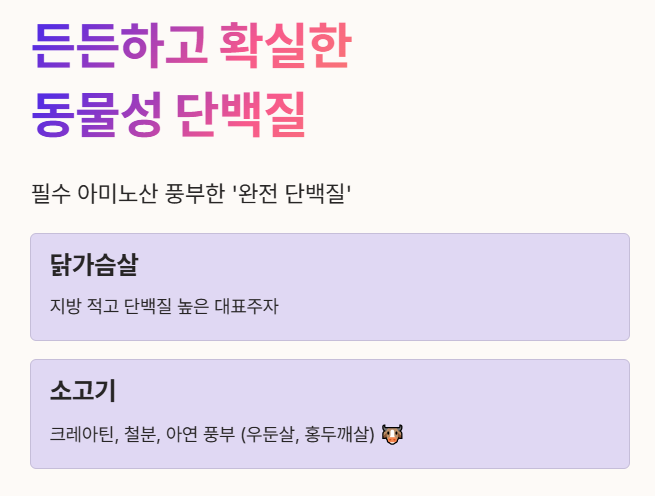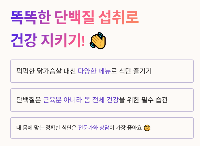 - 가장 중요한 것은 '균형'이에요. 단백질에만 치우치지 말고 탄수화물, 지방, 비타민, 무기질 등 다양한 영양소를 골고루 섭취해야 건강한 신체를 유지할 수 있답니다. 🥗