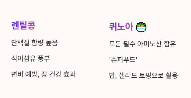 - 렌틸콩은 단백질 함량이 매우 높을 뿐만 아니라, 식이섬유가 풍부해 변비 예방과 장 건강에도 탁월한 효과가 있어요.