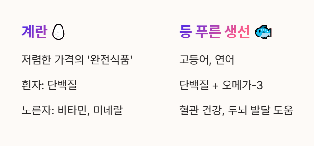 - 단백질은 물론, 몸에 좋은 불포화지방산인 오메가-3가 풍부해 혈관 건강과 두뇌 발달에도 도움을 줘요. 🐟