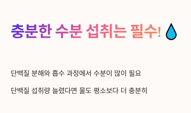 - 단백질 섭취량을 늘렸다면, 물도 평소보다 더 충분히 마셔주는 것이 좋습니다.