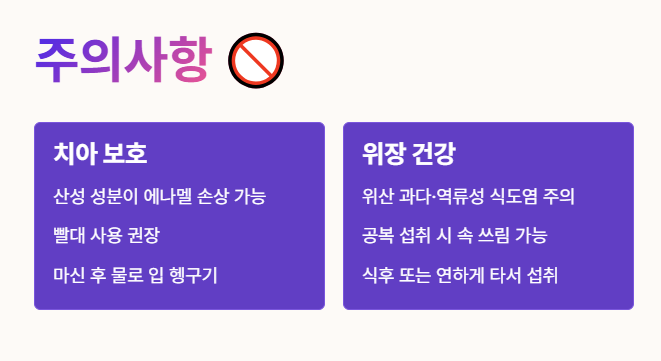 또한, 위가 약하거나 위산 과다, 역류성 식도염 증상이 있는 분들은 공복에 마실 경우 속 쓰림을 유발할 수 있으니, 식후에 마시거나 연하게 타서 마시는 것이 안전해요.