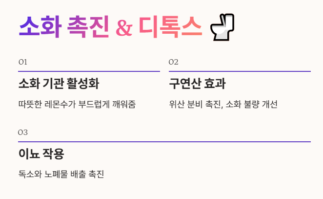 따뜻한 물은 위장에 부담을 덜 주고 소화를 도우며, 체내 흡수율을 높여 레몬수의 효능을 극대화하는 데 도움이 됩니다.