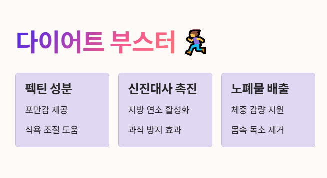 또한, 신진대사를 활발하게 만들어 체내 지방 연소를 돕고, 몸속 노폐물 배출을 촉진하여 체중 감량에 긍정적인 영향을 줄 수 있습니다.