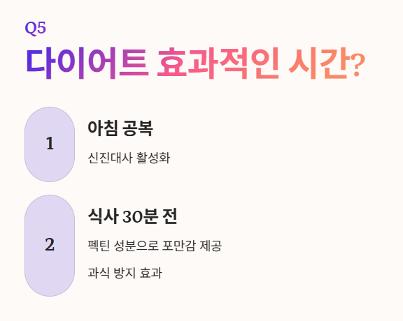 Q5: 다이어트 때문에 마시는데, 언제 마시는 게 가장 효과적인가요?