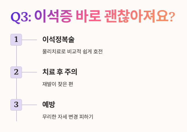 - 하지만 재발이 잦은 편이므로, 치료 후에도 무리한 자세 변경은 피하는 것이 좋습니다.