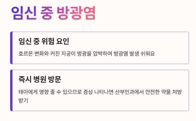 - 임신 중에는 호르몬 변화와 커진 자궁이 방광을 압박하여 방광염에 걸리기 쉬워요.