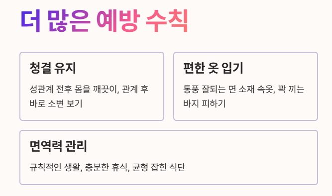 - 청결 유지: 성관계 전후에는 몸을 깨끗이 하고, 관계 후에는 바로 소변을 보는 것이 좋아요.