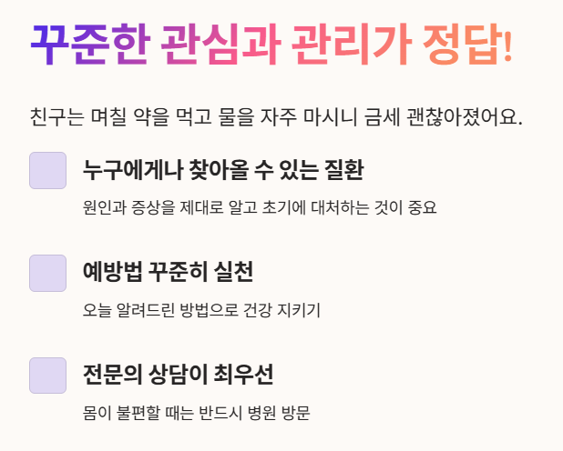 오늘 알려드린 예방법을 꾸준히 실천해서 건강을 지키시길 바랄게요. ✨
