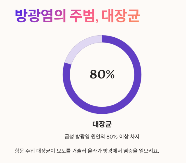 급성 방광염을 일으키는 가장 흔한 원인균은 대장균으로, 전체 원인의 80% 이상을 차지해요.