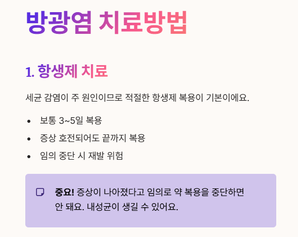 - 방광염의 주된 원인은 세균 감염이므로, 적절한 항생제를 복용하는 것이 기본적인 치료법이에요.