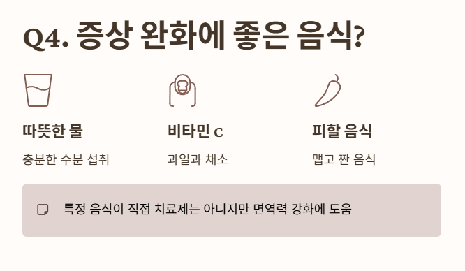 - 특정 음식이 직접적인 치료제는 아니지만, 면역력 강화에 좋은 따뜻한 물, 비타민 C가 풍부한 과일, 채소 등이 도움이 돼요. 🥦