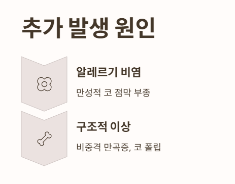 - 코 안이 휘어있는 '비중격 만곡증'이나 코에 물혹(폴립)이 있는 경우에도 발생할 수 있습니다.