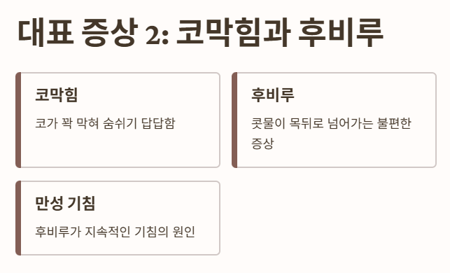 - 코가 꽉 막혀 숨쉬기 답답하고, 콧물이 목뒤로 넘어가는 '후비루' 증상이 나타나요. 😫