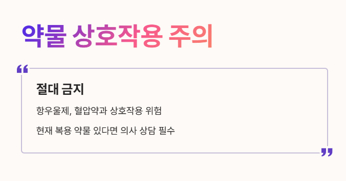 - 현재 복용 중인 약이 있다면, 반드시 의사 또는 약사와 상담 후 섭취 여부를 결정해야 합니다.