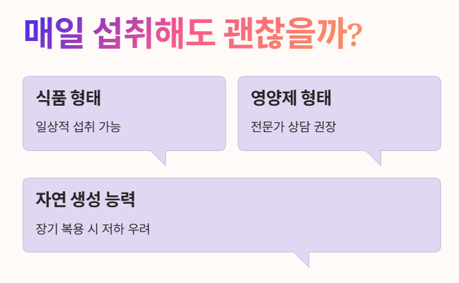 - 식품 형태로 섭취하는 것은 괜찮지만, 영양제 형태로 매일 장기간 섭취하는 것에 대해서는 전문가와 상담하는 것이 좋습니다.