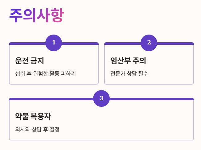 - 섭취 후에는 운전이나 위험한 기계 조작은 피해야 해요.