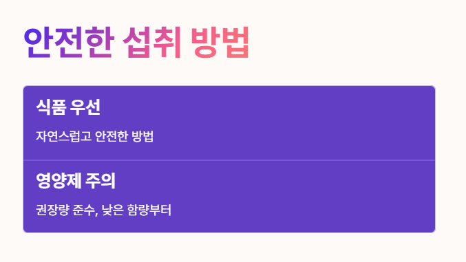 - 반드시 권장량을 지키고, 부작용이 나타나면 즉시 섭취를 중단하고 전문가와 상담하세요.
