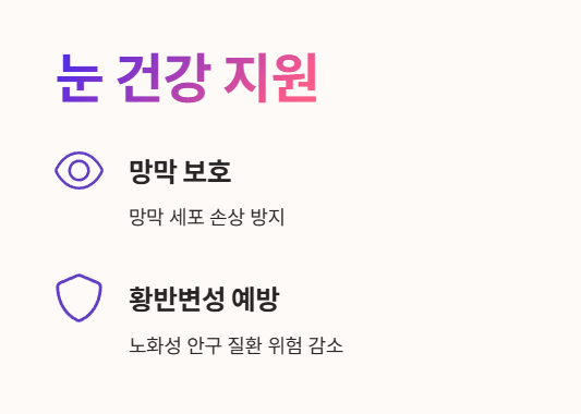 - 눈의 망막 세포를 보호하고, 노화로 인해 발생할 수 있는 황반변성과 같은 안구 질환의 위험을 줄이는 데 도움을 줄 수 있다는 연구 결과도 있어요. 👁️