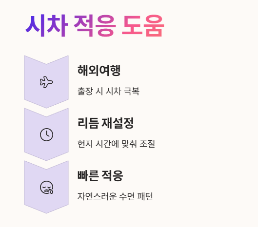 - 인위적으로 잠에 취하게 하는 것이 아니라, 수면-각성 주기를 정상화하여 자연스럽게 잠이 오도록 돕는 역할을 하므로 효과는 개인에 따라 다를 수 있습니다.