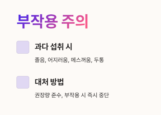- 과다 섭취 시 졸음, 어지러움, 메스꺼움, 두통 등의 부작용이 나타날 수 있습니다.