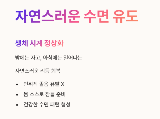- 인위적으로 잠에 취하게 하는 것이 아니라, 몸이 스스로 잠들 준비를 하도록 돕는 거죠.