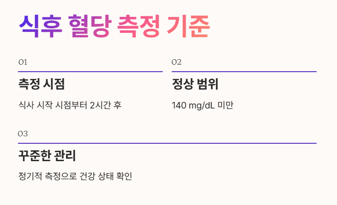 - 식후 1시간 혈당은 최고치를 기록하는 경우가 많아, 혈당이 안정되는 2시간째 수치를 통해 관리 상태를 확인하는 것이 일반적이랍니다.