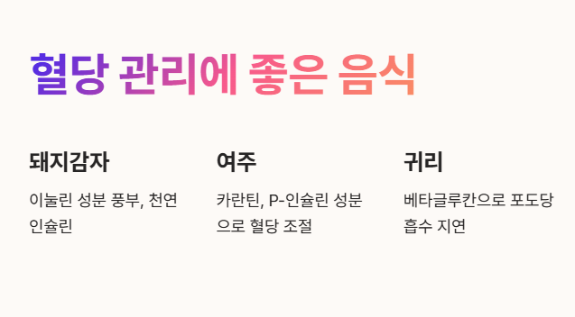 - 돼지감자: '천연 인슐린'이라고 불리는 이눌린 성분이 풍부해 혈당 조절에 도움을 줘요.