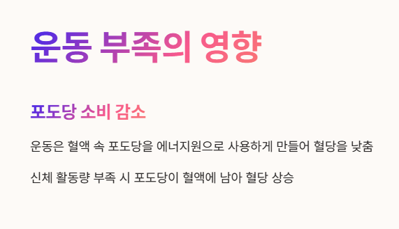 - 하지만 신체 활동량이 부족하면 포도당이 제대로 소비되지 못하고 혈액에 남아 혈당이 높아지게 됩니다. 🚶♀️