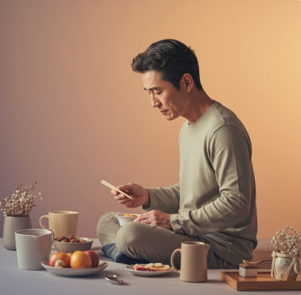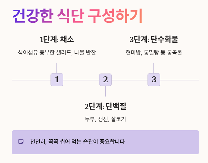 - 단백질(두부, 생선, 살코기)을 섭취한 후, 마지막으로 통곡물(현미밥, 통밀빵) 같은 복합 탄수화물을 먹는 '거꾸로 식사법'을 실천해 보세요.