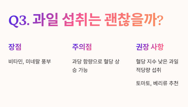 - 당뇨병 환자나 전단계에 있다면 한 번에 많은 양을 먹기보다, 혈당 지수가 낮은 과일(토마토, 베리류 등)을 적당량 섭취하는 것이 좋습니다.