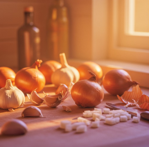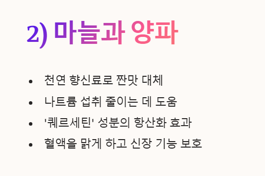 - 마늘과 양파는 짠맛을 대신할 훌륭한 천연 향신료예요.