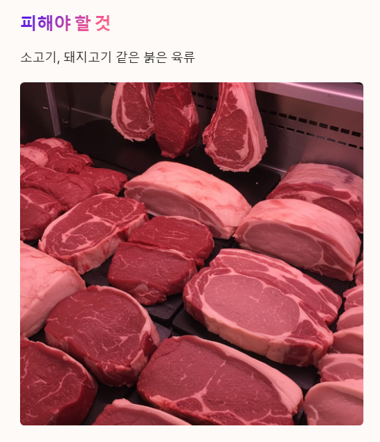 - 특히 소고기, 돼지고기 같은 붉은 육류보다는 생선이나 달걀흰자, 두부를 통해 적정량의 단백질을 섭취하는 것이 현명해요.