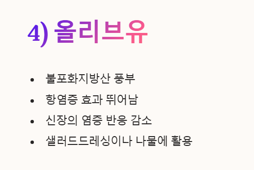 - 올리브유, 특히 엑스트라 버진 올리브유는 건강한 지방인 불포화지방산이 풍부해요.